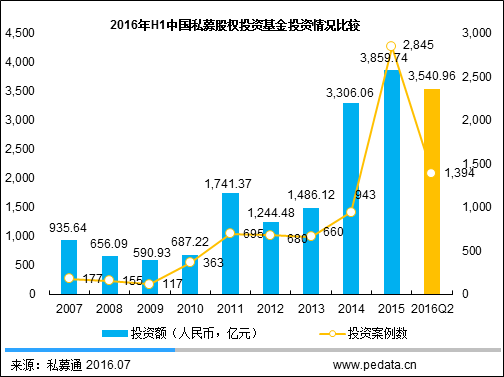 大中华区著名创业投资与私募股权研究机构清科研究中心近日发布2016年上半年中国私募股权投资市场数据统计结果。数据显示,从募集环节来看,上半年共有696支私募股权投资基金募集完毕。其中已披露募集金额的484支基金中,募集到位的金额共3,236.29亿元人民币,基金总募集金额同比增长了6.7%。投资方面来看,中国私募股权投资市场上半年共发生投资案例1,394起,其中披露金额的投资事件共计1,243起,涉及金额3,540.96亿元人民币,投资案例数同比下降4.7%,而投资总金额则同比上升85.9%,究其原因,是大额投资案例拉动了总投资额。在退出市场中,2016年上半年共发生退出事件915笔,同比增长4.9%。新三板挂牌数量大幅增长,而作为退出主要方式的并购和IPO事件数量则在萎缩。2016年上半年PE机构所投企业通过新三板进行退出的案例数共计677笔,占全部退出案例的74.0%;此外,发生并购退出事件95笔,IPO退出事件75笔。